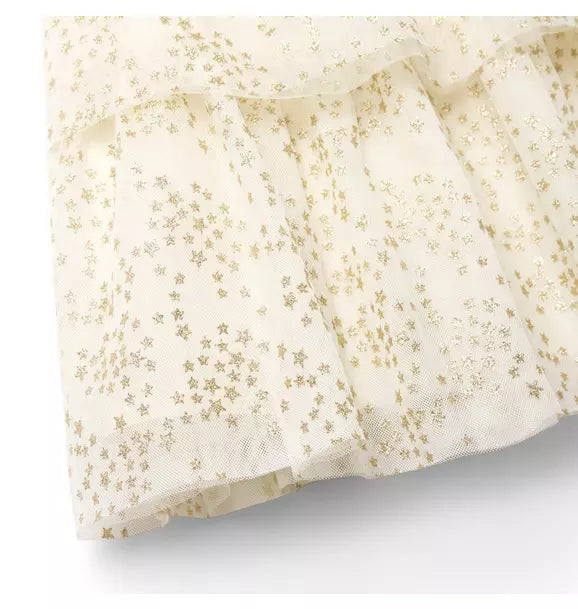 • A fashionable moment is written in the stars. Our limited-edition dress features sparkling star tulle, flutter sleeves and tiered ruffles. Made to match with their favorite American Girl Doll.