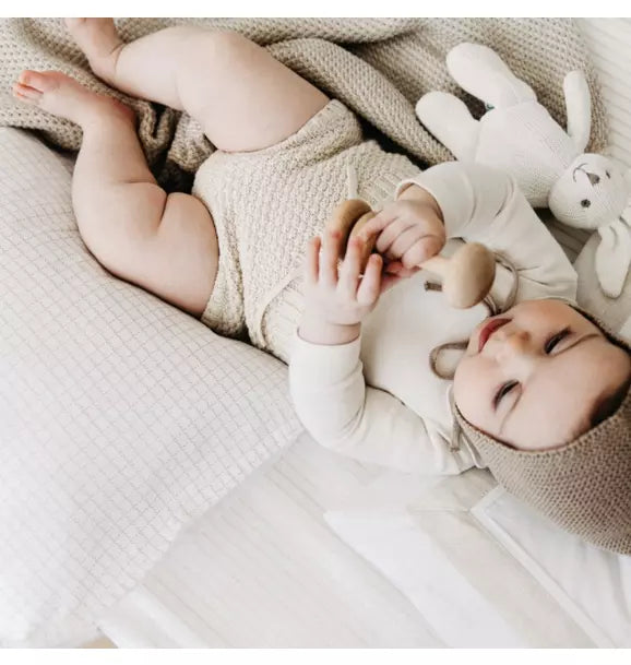 • The Brunello baby blanket is designed with a linear dotted design, finished with a natural border.
