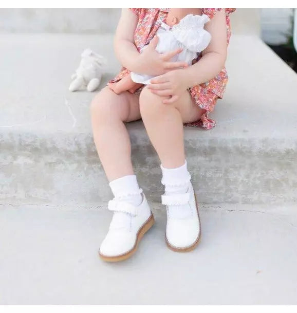 • Classic Mary Janes with scalloped edges