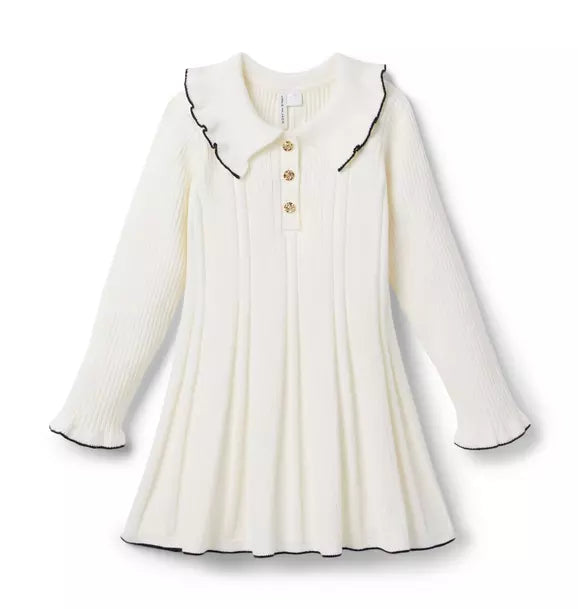 • Get dressed for sweater season in this cozy ribbed favorite. Designed with contrast tipping, a ruffle edge collar and gold-tone buttons too.