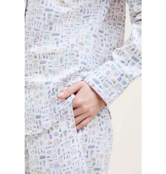 • The perfect pajamas for bonding over family recipes. This hand-illustrated print has all the tools you'll need for perfecting pastries, cookies, and gingerbread houses. This classic sleep shirt has a roomy fit but looks crisp thanks to details like the classic collar and elegant shirt-tail hem. Premium 100% cotton twill makes this design crisp, comforting, and cozy. The moisture-wicking weave is yarn-dyed to help prevent fading. Cotton twill becomes more buttery with every wash. You will be tucked in luxury and off to dreamland. Bonne nuit.